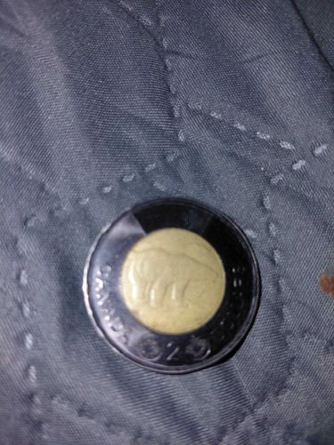 A unique black-ringed circulation coin featuring a polar bear on the reverse. The outer ring is distinguished by its deep black color, framing the gold-colored center core.