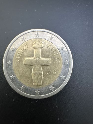 The coin features a cruciform idol from the Early Bronze Age (3000-2500 BC) on its inner core. The idol is characteristic of Cypriot prehistoric art. The year of issue, '2012', is below the idol. The outer ring features twelve stars representing the European Union. The name of Cyprus is inscribed in both Greek ('ΚΥΠΡΟΣ') and Turkish ('KIBRIS') around the upper part of the inner core.