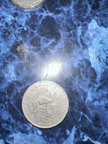 The obverse of the coin features two dromedaries (camels), one standing and one couchant, with the denomination '50 F' or '50 FRANCS' above them. The text 'REPUBLIQUE DE DJIBOUTI' and 'UNITE EGALITE PAIX' are typically found around the rim. The reverse usually features the emblem of Djibouti.