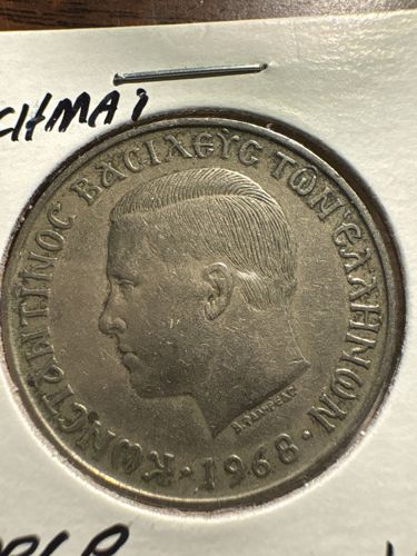 This coin was issued during the reign of King Constantine II, the last King of Greece. Specifically, 1968 was a year during the Greek military junta (Regime of the Colonels) which had seized power in 1967. Despite the king being in exile following a failed counter-coup, his image remained on the coinage for several years until the monarchy was officially abolished in 1973.