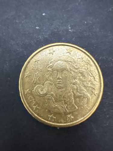 The obverse of the coin features a depiction of Umberto Boccioni's 'Unique Forms of Continuity in Space' which is a famous Italian futurist sculpture. However, the provided image shows a different design, specifically a portrait that closely resembles Sandro Botticelli's 'Birth of Venus', with the date '2018' and the intertwined 'RI' monogram for Repubblica Italiana (Italian Republic). Surrounding the central design are 12 stars of the European Union. The coin has a golden appearance and a reeded edge.