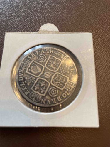 A silver coin featuring the royal arms of England presented in a shield design, often used in everyday transactions.