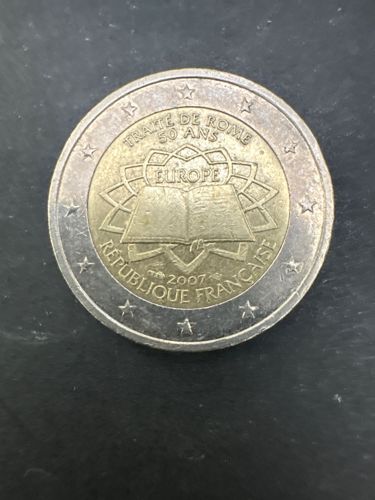 The coin features an open book, symbolizing the Treaty of Rome, with 'EUROPE' inscribed above it. Radiating lines connect the book to a stylized 'Europa' design. The inscription 'TRAITÉ DE ROME 50 ANS' (Treaty of Rome 50 years) and 'RÉPUBLIQUE FRANÇAISE' (French Republic) along with the year '2007' are also present. The outer ring contains the twelve stars of the European Union.