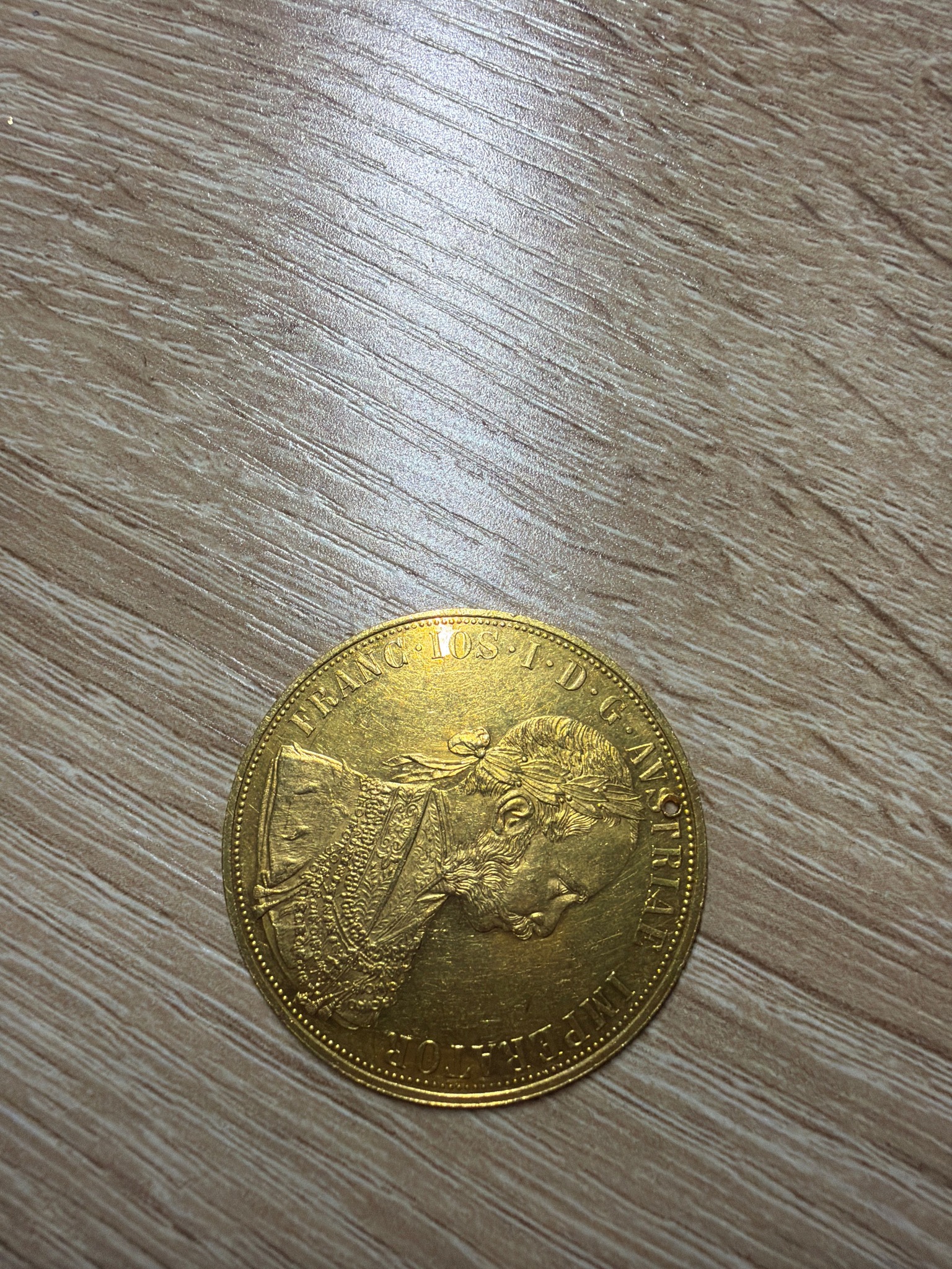 A large, very thin gold coin featuring the right-facing bust of Emperor Franz Joseph I.