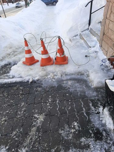 The provided image does not contain a coin. It shows three orange traffic cones standing in snow and slush on a sidewalk.