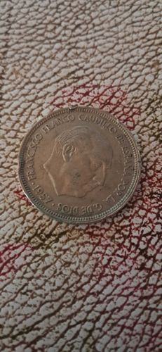 This coin was issued during the regime of General Francisco Franco, who ruled Spain from 1939 to 1975. The inscription translates to 'Francisco Franco, Leader of Spain by the Grace of God,' reflecting the political and religious ideologies of the Francoist era.