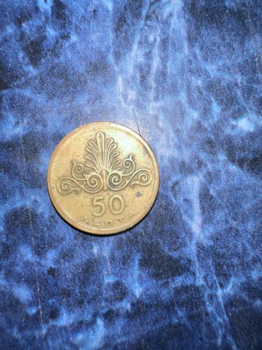 The coin features a stylized image of a palmette, which is a symbolic motif resembling a palm leaf, commonly found in Ancient Greek and Roman art. Below the palmette, the denomination '50 ΛΕΠΤΑ' (50 Lepta) is inscribed. The overall design suggests a classical aesthetic.