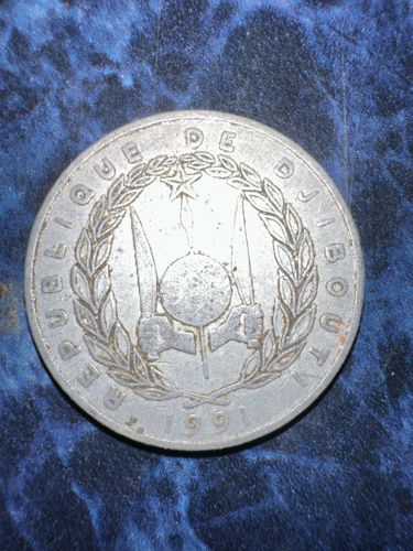 This coin represents the currency of Djibouti, a strategically important country located in the Horn of Africa. The Coat of Arms on the coin symbolizes the nation's independence and sovereignty, featuring traditional elements like spears and a shield. The year 1991 falls within a period of political stability after Djibouti gained independence from France in 1977, and it was a time when the country was establishing its national identity and monetary system.
