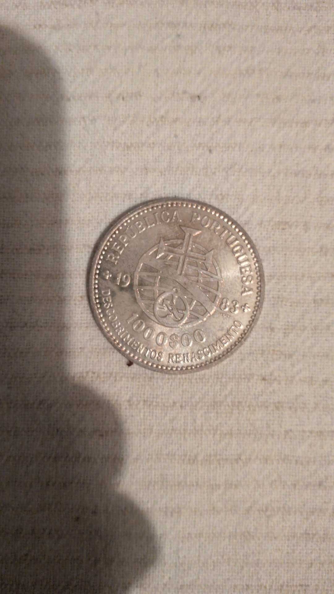 The obverse features the Portuguese coat of arms (an armillary sphere with a shield) and the legend 'REPÚBLICA PORTUGUESA'. The lower text reads 'DESCOBRIMENTOS RENASCIMENTO' and the value '1000$00'. The year '1983' is split across the globe.