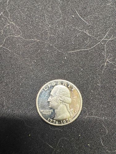 The coin shows the profile of George Washington on the obverse (front) with the dual dates 1776-1976 below. The reverse (back) features a colonial drummer. The coin appears to have some toning or discoloration.
