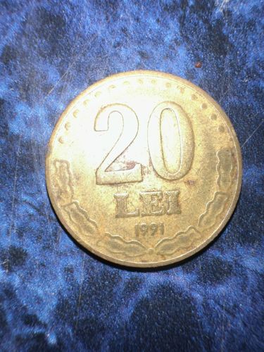 The coin shows the denomination '20 LEI' with the year '1991' below it. The numbers '20' are large and prominent.