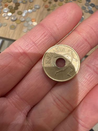 A small circular coin with a distinctive central hole. The obverse features an image of a 'discobolus' (discus thrower) alongside the word 'ESPAÑA' and the date 1996.