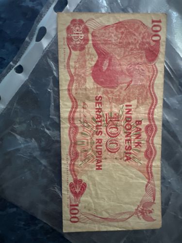 The banknote predominantly features red and cream tones. The obverse side displays an image of President Sukarno. The denomination '100' is visible multiple times, along with 'BANK INDONESIA' and 'SERATUS RUPIAH' ('ONE HUNDRED RUPIAH'). There are intricate decorative borders and patterns.